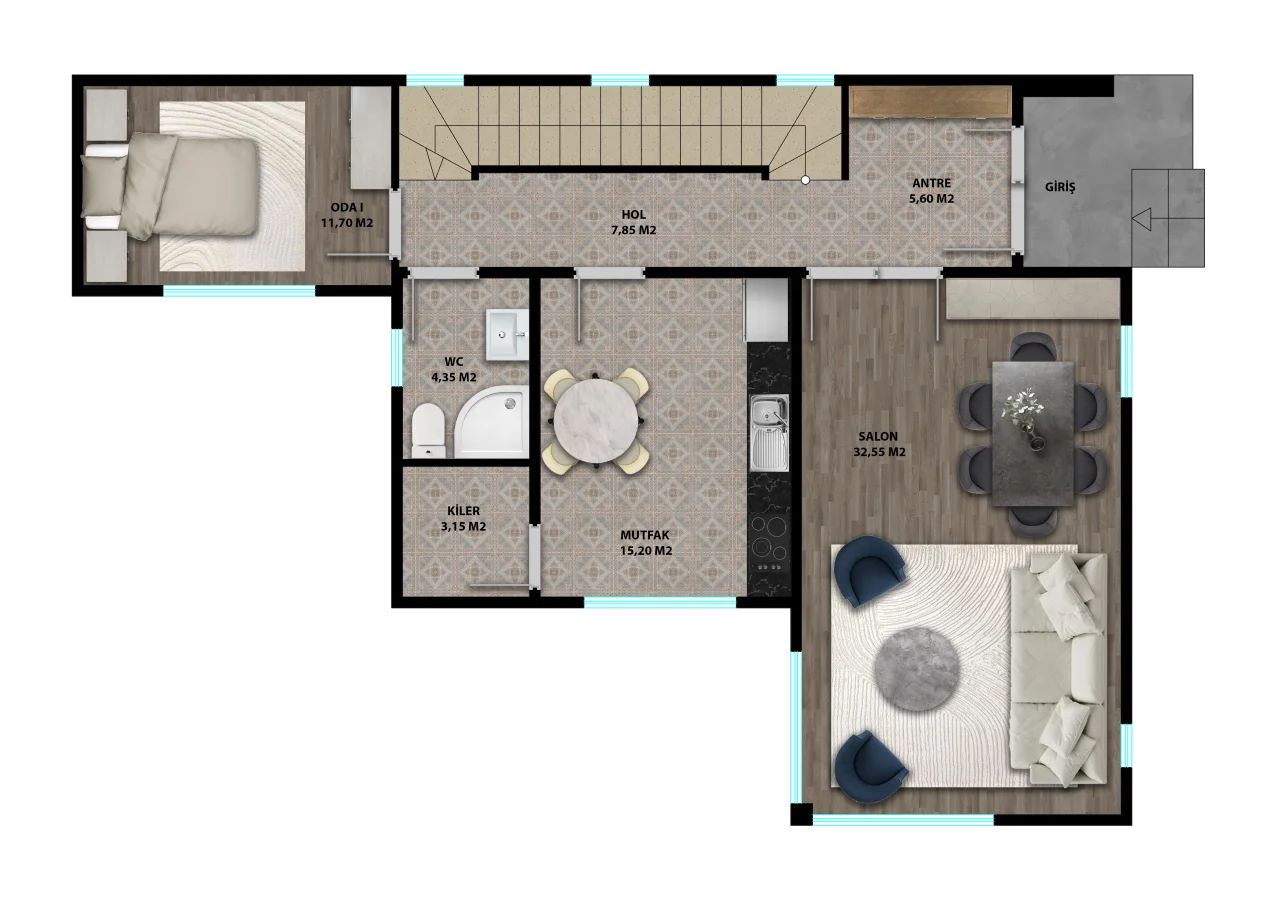 İç cephe uygulaması: Kaba karışık alçı, derz bandı, iki kat saten alçı ve silinebilir Filli marka boya