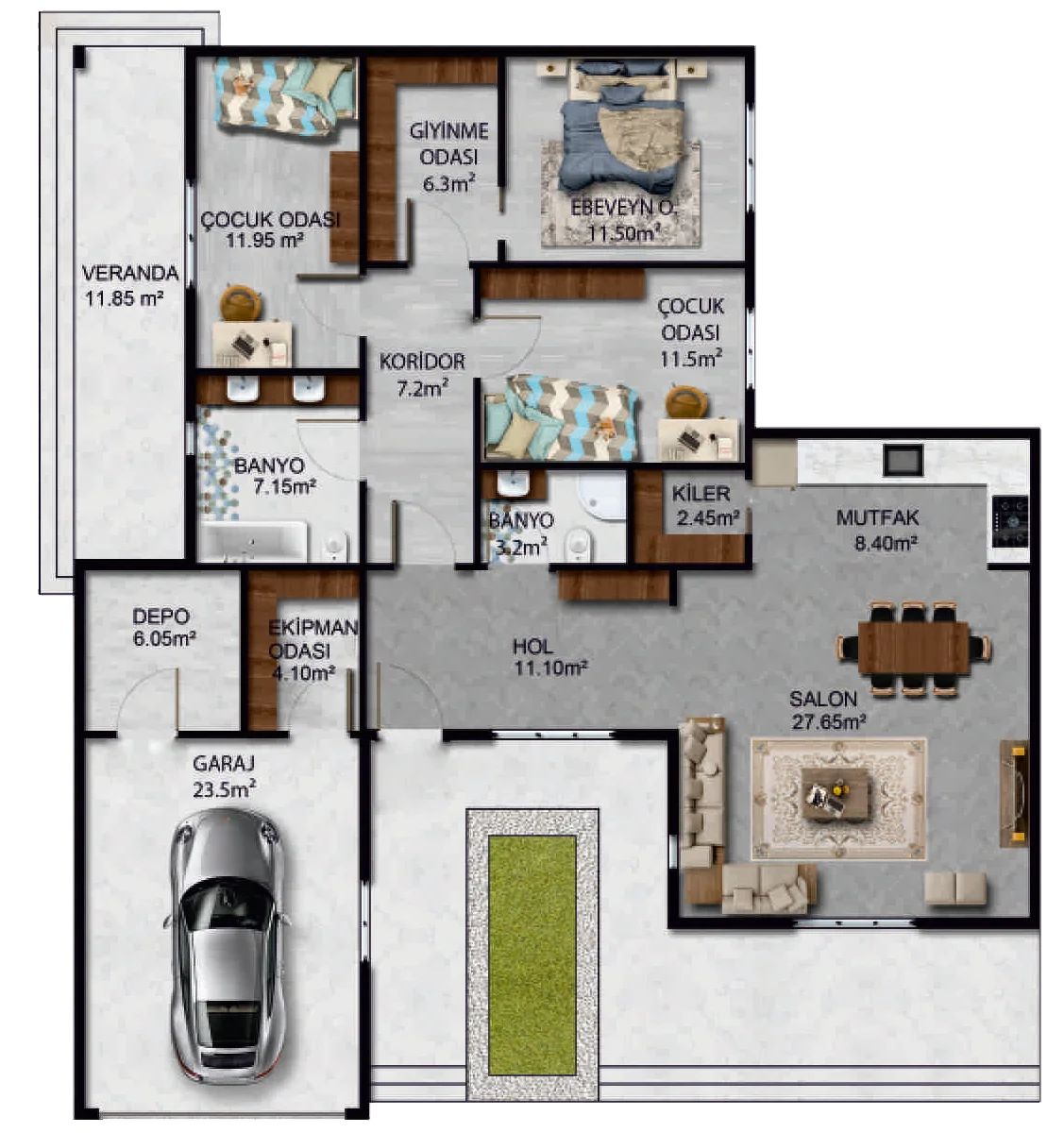 İç cephe uygulaması: Kaba karışık alçı, derz bandı, iki kat saten alçı ve silinebilir Filli marka boya
