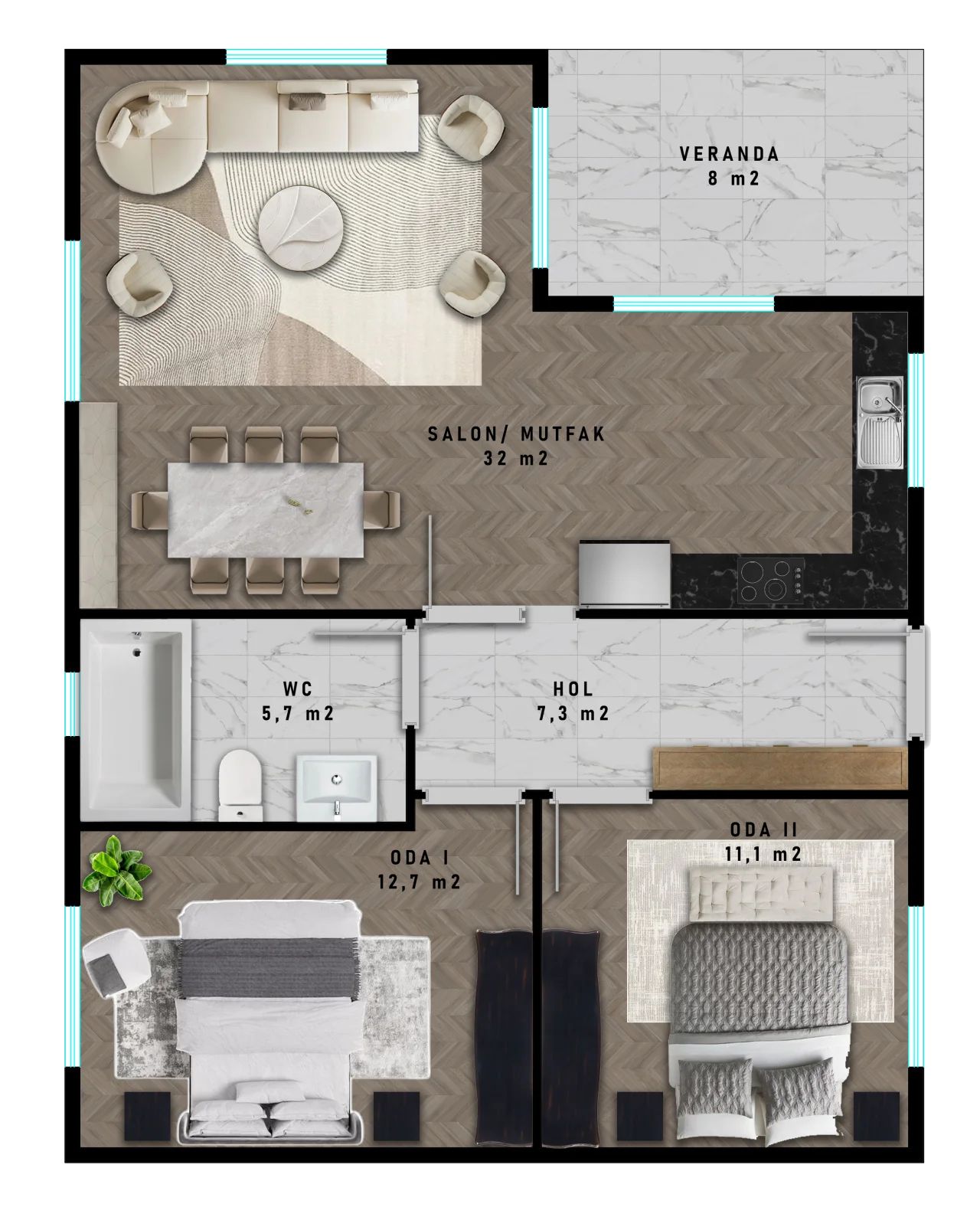 İç cephe uygulaması: Kaba karışık alçı, derz bandı, iki kat saten alçı ve silinebilir Filli marka boya